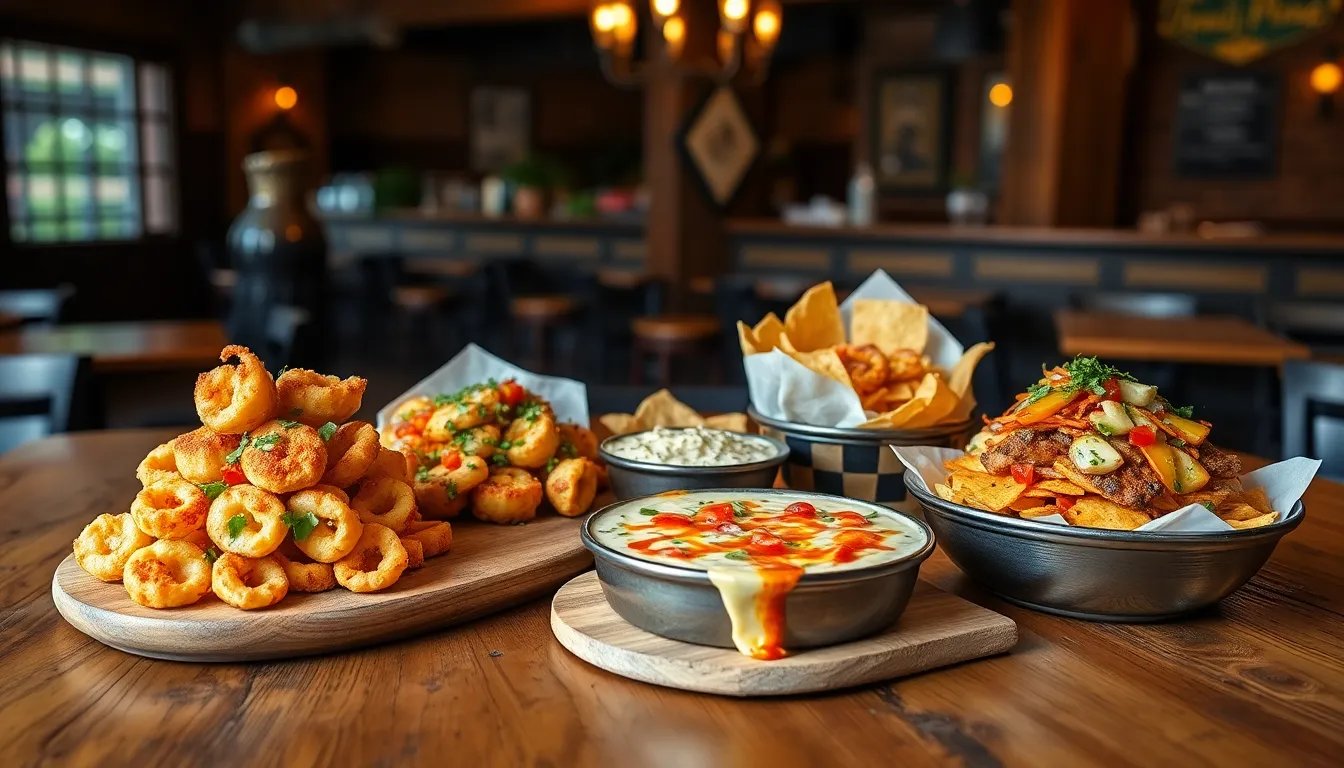 Crispy calamari serves as a crowd favorite with its perfectly seasoned coating. Bruschetta features fresh tomatoes and basil atop toasted bread, providing a burst of flavor. Spinach artichoke dip combines creamy textures with crispy tortilla chips for a satisfying crunch. Loaded nachos benefit from generous toppings of cheese, guacamole, and jalapeños. Each dish highlights a unique flavor profile, setting an impressive tone for the meal ahead.